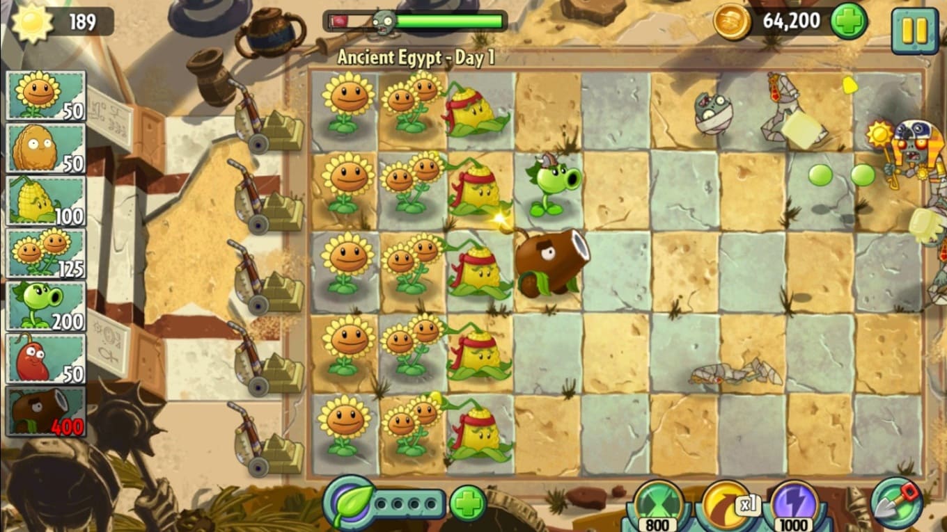 Plants vs. Zombies 2 – увлекательная аркадная стратегия, в которой твоя задача – создать не просто сад, а настоящую крепость из мощных растений! На лужайке развернется битва за выживание, ведь на нее надвигаются полчища зомби, готовых на все ради свежих мозгов. У них не получится добраться до тебя так просто – каждый твой цветок, куст или кактус способен дать отпор этим хитроумным и опасным ходячим.