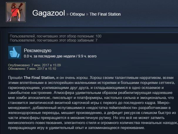 Разработчики The Final Station практически без ресурсов сумели сделать одно из самых захватывающих путешествий по миру, где человечество находится на грани выживания. Всем любителям инди-игр рекомендуется!