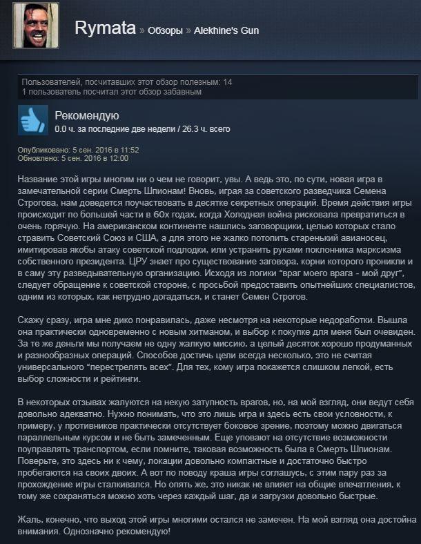 Игровой проект, совмещающий в себе несколько жанров: стелс и шпионский экшен. В Alekhine's Gun предстоит сыграть за агента контрразведки, который был отправлен для решения сложнейших заданий. События развиваются в период Холодной войны на территории Америки. В роли персонажа выбран Семен Строгов, являющийся агентом организации СМЕРШ. Вы сможете побывать в нескольких регионах и посетить Кубу, Северную Америку и перенестись в Европе.