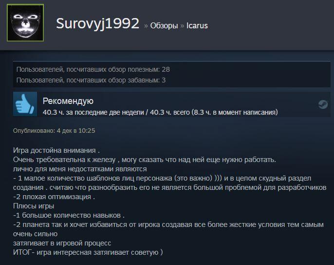 ICARUS – приключенческий экшен с элементами выживания, перемещающий пользователей на планету, подобную Земле, где вы будете совместно с друзьями или другими игроками выживать, собирать ресурсы и заниматься другими делами. Действия игры происходят на планете Икар, которая в свое время должна была стать надеждой человечества. Здесь впервые были применены технологии терраформирования, но по необъяснимым причинам, планета превратилась в непригодное для существования место. Долгое время объект никто не посещал, но теперь сюда прибыли люди, с целью получения доступа к новым ресурсам. Десятки компаний отправили челноки с добровольцами для получения плодов «новой золотой лихорадки».