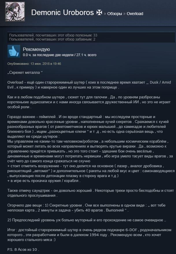 Игровой проект, представляющий собой достаточно простой, но в то же время интересный шутер. В Overload применяется интуитивное управление с великолепной визуализацией и музыкальным сопровождением, которое дает более детально прочувствовать атмосферу и геймплей. Всего подготовлено 6 уровней, в каждом из них предлагаются свои уникальные особенности.