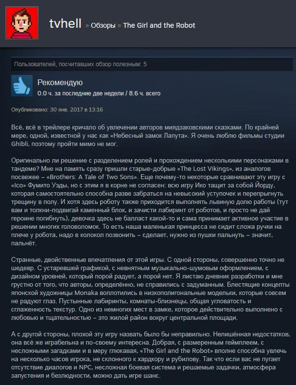 The Girl and the Robot – приключенческий экшен от 3-го лица, развивающийся в сказочной вселенной, где под ваше управление попадает молодая девушка, решившая сбежать из замка, находящегося под контролем злой королевы. По дороге ей встречается необычный робот с возможностью дистанционного управления. Вместе, им придется преодолеть ряд испытаний, которые сделают дружбу ними крепче. Переключайтесь между героями, выполняйте задания, проходите испытания и решайте головоломки. Вы будете исследовать удивительный мир, где поджидают враги, с которыми придется сражаться.