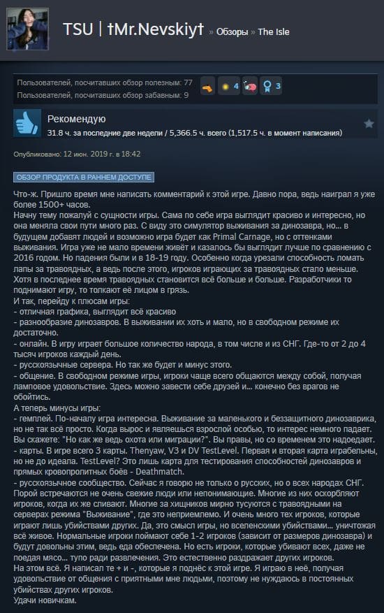 The Isle – многопользовательский симулятор, переносящий в динамичный мир, где каждый шаг – это борьба за существование. Огромный остров площадью 250 квадратных километров наполнен живописными равнинами, пустынями, густыми джунглями и древними руинами, хранящими множество секретов. Благодаря процедурной генерации окружения и событий, каждое прохождение становится уникальным, меняя расположение артефактов, ресурсов и квестовых предметов.