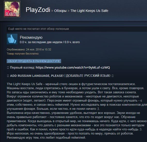 Стелс-боевик под названием The Light Keeps Us Safe с достаточно мрачными приключениями, в которых придется участвовать от первого лица. События будут происходить в альтернативном будущем, где мир переполнен роботами, новыми технологиями, мраком и ужасающими ситуациями. Вражеские силы практически погубили человечества и теперь обитают только в темноте, пытаясь избегать света. Вы выступите в роли выжившего, который прятался в убежище, но провизии больше нет и необходимо выбираться наружу.