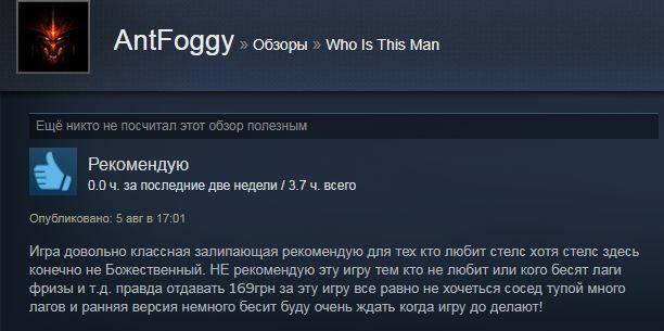 Шпионская игра под названием Who Is This Man, в которой предлагается заняться слежкой за своим соседом и докладывать о происходящем в штаб. Тема шпионажа довольно хорошо развита в этом проекте, ведь дополнительно вам предстоит собирать улики, проникать в дом, собирать информацию, контакты и взламывать компьютер. Необходимо максимально ответственно подходить к выполнению каждого действия.