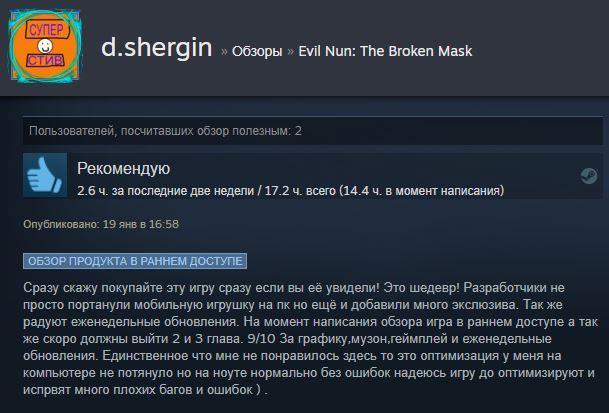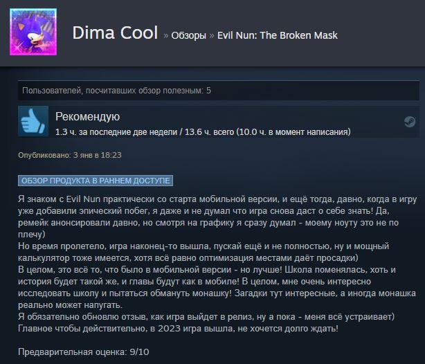 Evil Nun: The Broken Mask – проект от первого лица с реалистичной графикой и геймплеем выживания в жутком атмосферном мире. Протагонисту приходит приглашение провести время в религиозном летнем лагере, расположенном на берегу озера. Как только вы попадаете на указанную территорию, понимаете, что все не так, как думалось. Изучив ближайшие дома, вы попадаете к жестокой монахине, не желающий отпускать вас. Ваша задача сводится к тому, чтобы покинуть территорию, не привлекая к себе внимание, однако для этого должен быть разработан план побега и собраны нужные предметы.