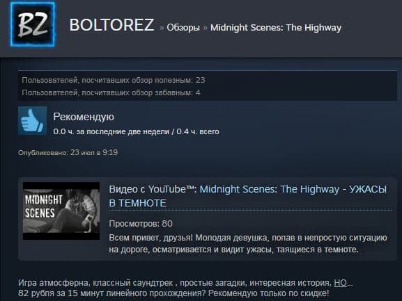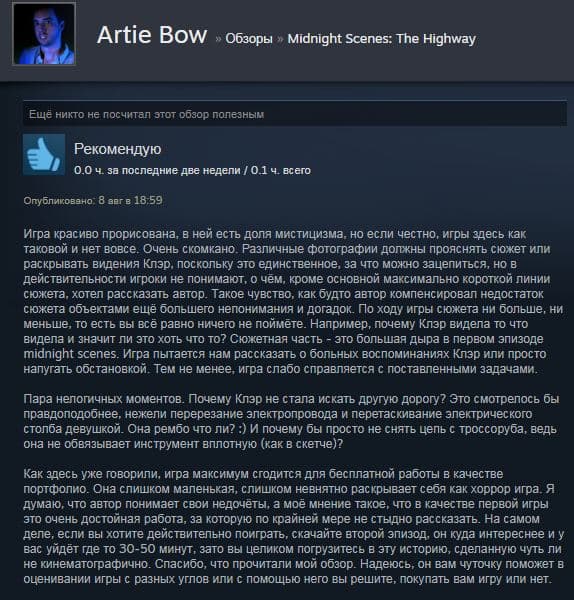 Приключенческий хоррор в черно-белых тонах с невероятно коротким, но впечатляющим сюжетом, способным затянуть игроков от самого начала и не отпускать до конца. Midnight Scenes: The Highway – игра, после которой есть послевкусие, позволяющее поразмыслить над многими вещами. В главной роли Клэр Барнс, девушка, которой предстоит узнать о предстоящих ужасах. Она едет на автомобиле и останавливается из-за упавшего на трассу столба, выйдя из машины она встречает нечто ужасное…