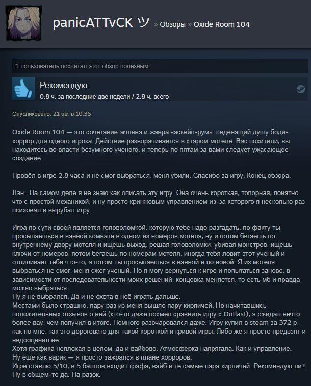 Oxide Room 104 – игра в жанре хоррора, обладающая потрясающей кинематографической картинкой и жуткой сюжетной линией. Главный герой пытался заключить выгодную сделку, но по некоторым обстоятельствам попал в передрягу. Некий психопат похитил протагониста и закрыл на территории полуразрушенного мотеля, где проживают создания ученого, болеющего боди-модификациями. Игра-выживалка с элементами побега из комнаты, где необходимо искать методы перехода в следующие области.