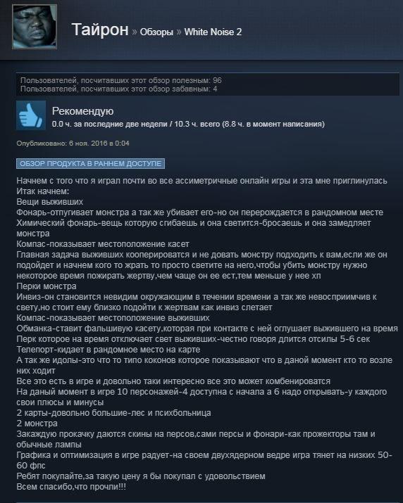 White Noise 2 – хоррор, совмещенный с экшеном, предлагающий поучаствовать в многопользовательском приключении от 1-го лица. Предлагается выбрать одну из сторон: жертву, убегающую от кровожадного противника, или самого монстра, пытающегося заполучить жизни людей. Кооперативная охота, где у каждого свои цели и задачи. Люди должны отыскать аудиозапись, спрятанную на просторах локации, а монстр должен поодиночке выловить жертв.