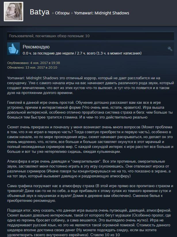 Yomawari: Midnight Shadows – приключенческий хоррор с видом сверху, являющийся продолжением предыдущей части. События рассказывают об окончании летних каникул, когда две маленькие девочки пошли в горы, чтобы посмотреть фейерверки. Скоропостижно наступила ночь, в результате чего дорога домой была потеряна. Девочки разделились и попали в ночной город, который решили изучить.