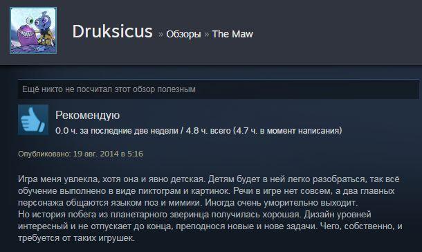 The Maw – платформер с юмористическим содержимым, в котором игроки узнают о забавном персонаже. Его сущность жизни – есть и отдыхать. Персонаж представлен в виде пухлого шарика, впитывающего в себя все, что съест. Такая способность позволяет ему ставать крупнее и даже становиться неуязвимым. В это его главная проблема, ведь регулярное питание сделало из него настоящую опасность для всей галактики. Главным героем выступит его друг, Фрэнки, которому предстоит помогать товарищу и защищать его от угроз. Только взаимодействие друг с другом поможет спастись.