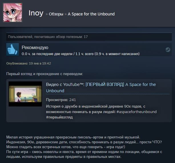 A Space for the Unbound – проект в жанре приключения, вызывающий комфортные ощущения, в котором игроки переносятся в Индонезию, периода 90-х годов и оказываются в маленькой деревне вместе с двумя подростками, Атмой и Райей. Эти милые пиксельные персонажи в ожидании окончания школы, чтобы перейти на следующий этап в своей жизни. Их ждет совершенно другое будущее, куда их планы не входят – мир перейдет в состояние апокалипсиса.
