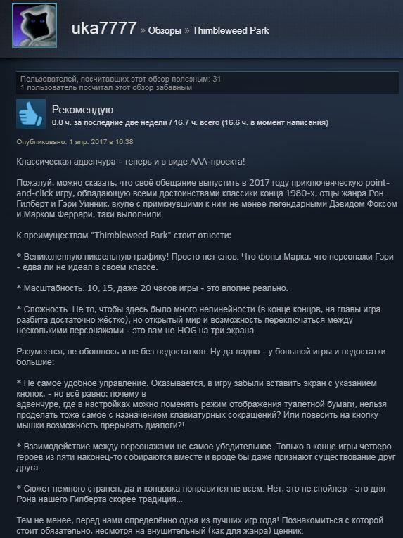 Игровой проект Thimbleweed Park в жанре хоррора, скомбинированного с квестом. Пользователям придется посетить мистическое место, город Тимблвид. Здесь проживает несколько десятков человек, а в самом городе творятся непонятные и мистические вещи. Результат странных событий – начинают погибать люди. В главной роли 5 персонажей – вам предстоит выяснить, как они связаны с этими событиями и в чем заключается главная тайна города.
