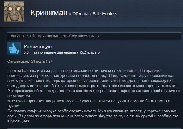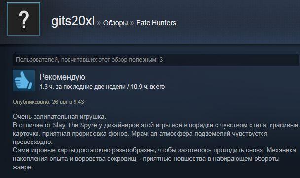 Карточный проект в жанре рогалика, предлагающий отправиться в одну загадочную башню, чтобы побороть нависшее там зло. Чтобы одолеть врагов, необходимо пройтись по всем этажам, убивать монстров и собрать уникальную колоду карт. Fate Hunters имеет игровой процесс, который основывается на использовании различных карт в сражениях. В колоде может быть оружие, снаряжение, враги, артефакты.