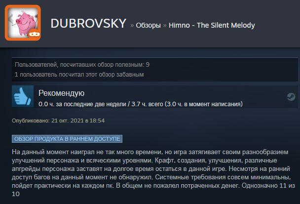 Himno - The Silent Melody – двухмерная РПГ-игра, использующая пиксельную графику. Пользователям предоставляется возможность бродить по сгенерированному миру, представленному в виде катакомб, где необходимо собирать материалы с целью создания арсенала. Отыщите место для базы и начните ее строительство, после этого позаботьтесь об автоматизации имеющихся машин и процессов. Во многом, игра схожая со старыми платформерами, что и создает удивительную атмосферу.