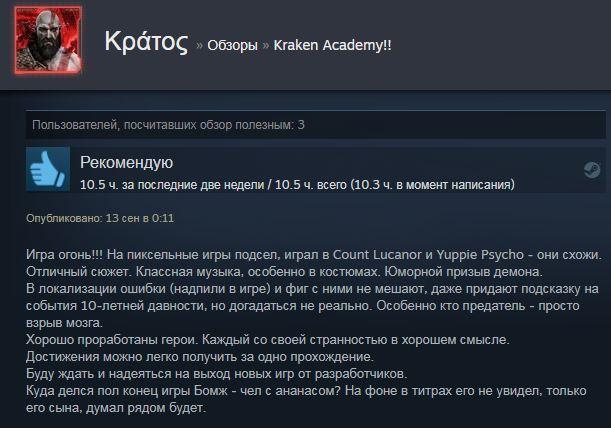 Kraken Academy!! – ролевая приключенческая игра с элементами квеста и экшена, в которой события развиваются в школе Кракен, где происходит настоящий хаос. Данное место довольно необычное, здесь происходят странные и жуткие события: убийства, секты, призраки, дикие животные убивают учеников. Из-за того, что события разворачиваются во временной петле, у вас имеется всего три дня на решение ситуации. Особенностью геймплея является то, что вы можете каждый раз переживать события по-новому и принимать другие решения.