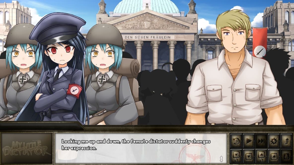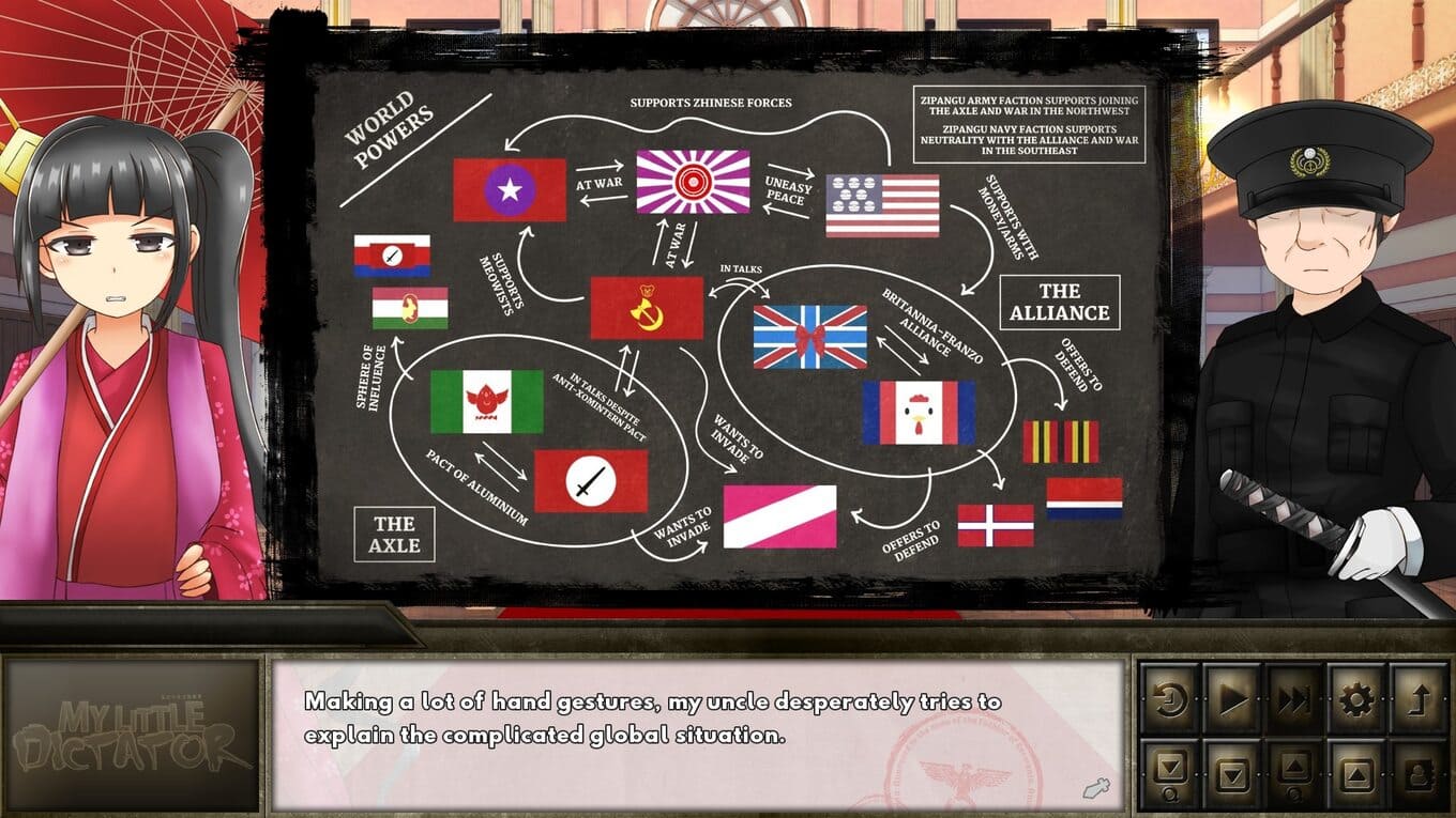 My Little Dictator – ролевая новелла с обилием сатиры и черного юмора, представляющая собой пародию на события Второй Мировой войны. В центре внимания диктаторы в стилистике аниме. Ситуация в Европе достаточно напряженная и мир в ожидании надвигающейся катастрофы. Во главе сюжета Ямато Ямамото, солдат которому суждено отправиться с секретной миссией, следить за главами государств. Ему предстоит сделать невозможное – справиться с могущественными историческими фигурами из многих стран той эпохи.