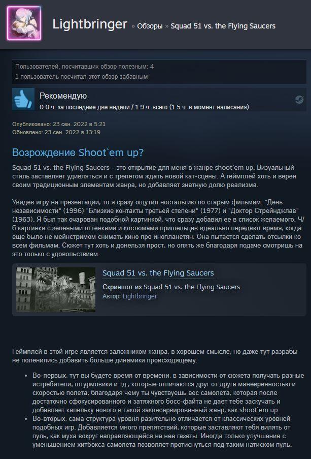 Squad 51 vs. the Flying Saucers – игра для тех, кому по нраву атмосферные стрелялки в ретро стиле. История рассказывает о том, как на Землю явилась инопланетная цивилизация, обещающая светлого будущего всем и везде. Как оказалось все не так гладко, ведь у гостей совершенно другие планы на человеческую цивилизацию, что впоследствии может привести к глобальной катастрофе. Возьмите под управление эскадрилью отважных бойцов, чтобы противостоять высокотехнологичным машинам захватчиков.