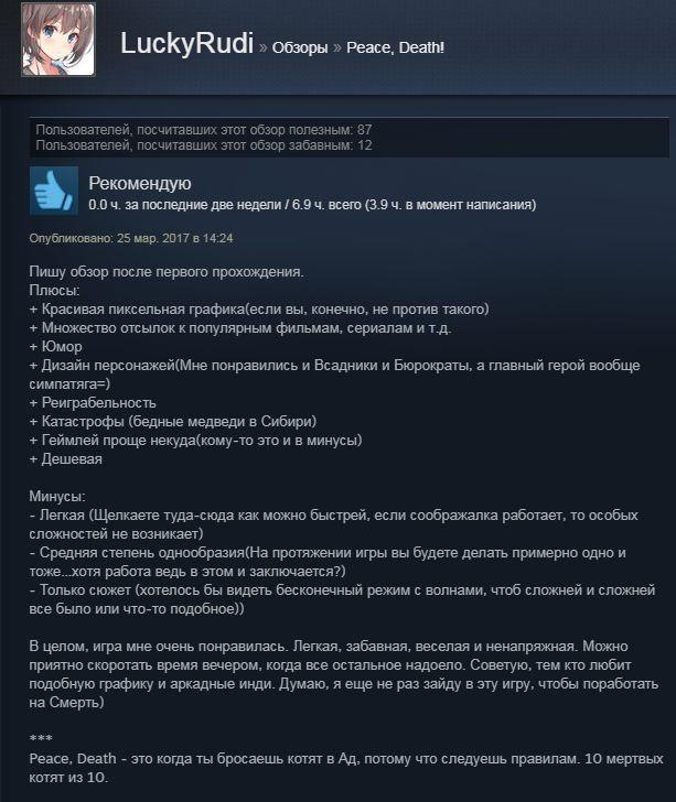 Аркадный симулятор, в котором вы будете играть за жнеца и вершить судьбы сотен умерших. В Peace, Death! Ваш персонаж умирает и вместо умиротворения, вам предлагается стать жнецом – тем, через кого будут проходить души других умерших. Вы сможете определять, чего достойны пришедшие, отправить их в Ад или Рай. Многие умерли не своей смертью, а некоторые из них вовсе самоубийцы – это также может повлиять на распределение.