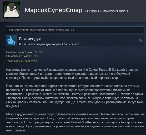 Ravenous Devils – хоррор с элементами симулятора, переносящий во вселенную черной комедии. Главные герои Персеваль и Хилдред пытаются как можно быстрее разбогатеть в новом городе, контролируя бизнес молодоженов. В задачи входит разработка идеального рецепта блюд, которое способно понравится всем без исключения посетителям. Ключевым ингредиентом является свежая человечина – довольно ужасно, но что поделаешь.