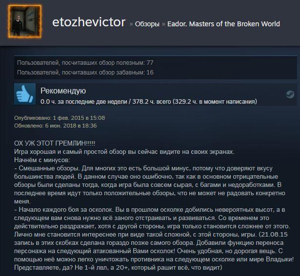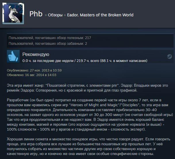 Eador. Masters of the Broken World – проект, относящийся к пошаговой стратегии. Сюжет перемещает пользователей в огромный фэнтезийный мир, в котором они столкнуться с необычными приключениями, кровавыми бойнями, испытаниями и магическими обрядами. Вселенная, где происходят события, состоит из осколков нескольких миров и островов, на которых ведется война Божеств за контроль над участками. Пользователи выступает в роли одного из Богов и посетят мир Эадор – его нужно сделать своей вселенной и стать для народа тираном, либо божественным правителем.
