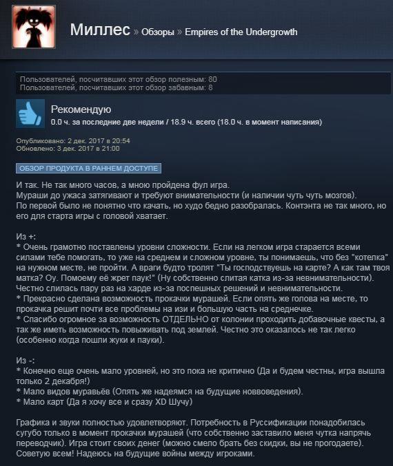 Довольно необычная стратегия, в которой предлагается взять под управление обычных муравьев. Empires of the Undergrowth предоставит доступ к полноценному муравейнику, над которым вы должны взять контроль и сделать все возможное для сохранения этой колонии от всевозможных бед и опасностей. Также, предстоит строить туннели, новые секции и заботиться о муравьях, их потомстве.