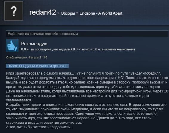 Градостроительный симулятор в апокалиптическом стиле, в котором пользователям предоставляется возможность восстановить человеческую цивилизацию. Endzone - A World Apart перенесет нас далеко в будущее, после глобальной катастрофы. В 2021 году террористическая организация одновременно подорвала все ядерные станции и выжившие двинулись в подземелья. Спустя долгое время, вы должны оценить ответственность и восстановить цивилизацию на поверхности. Вы – это лидер, которому дана задача по контролированию всех процессов.