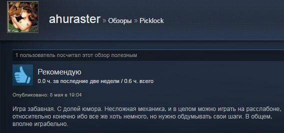 Увлекательный симулятор и стратегия в одном лице, предлагающая сыграть за молодого парнишку, сбежавшего из родного мегаполиса в результате нескольких неудачных дел. В Picklock герой решил пожить нормальной жизнью и отвлечься от воровства, но истинная сущность взяла свое. События разворачиваются в маленьком городке, куда собственно сбежал воришка под кличкой «Отмычка». Честно жить не совсем удобно, особенно такому профессионалу – поэтому герой взялся за старые дела.