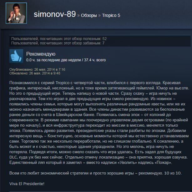 Tropico 5 мы советуем каждому поклоннику жанра, ведь благодаря красочной картинке и глубокой игровой механике игра получилась действительно стоящей.